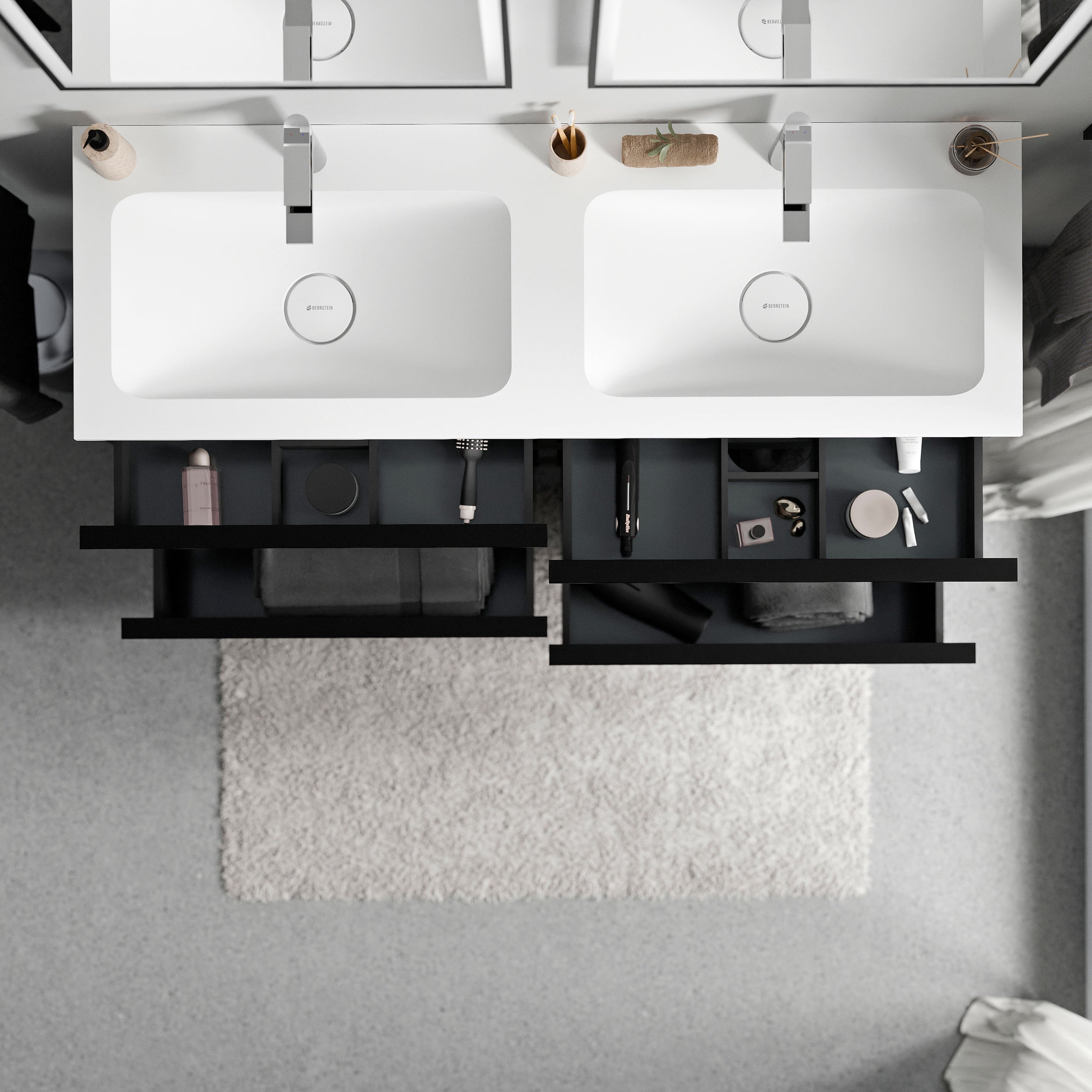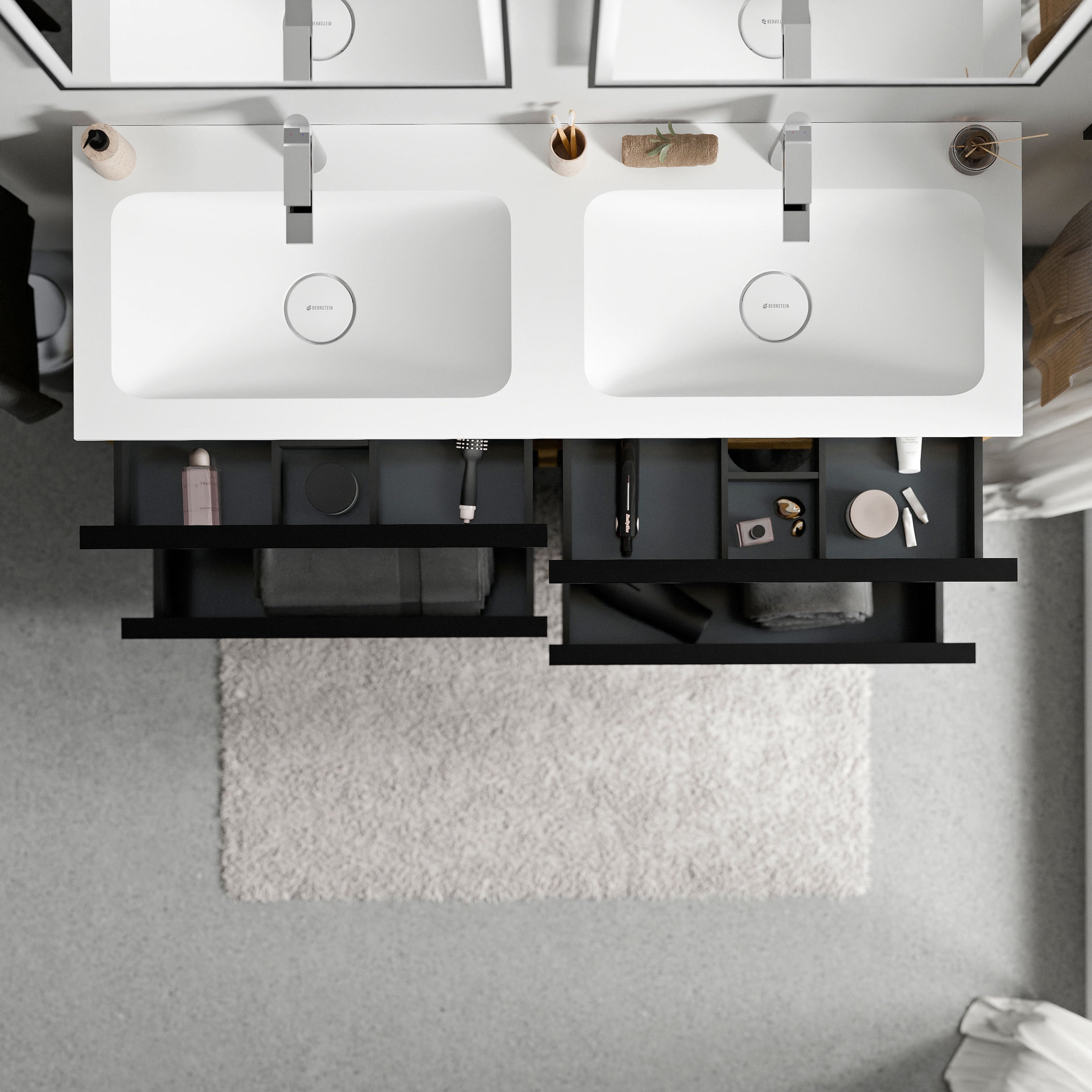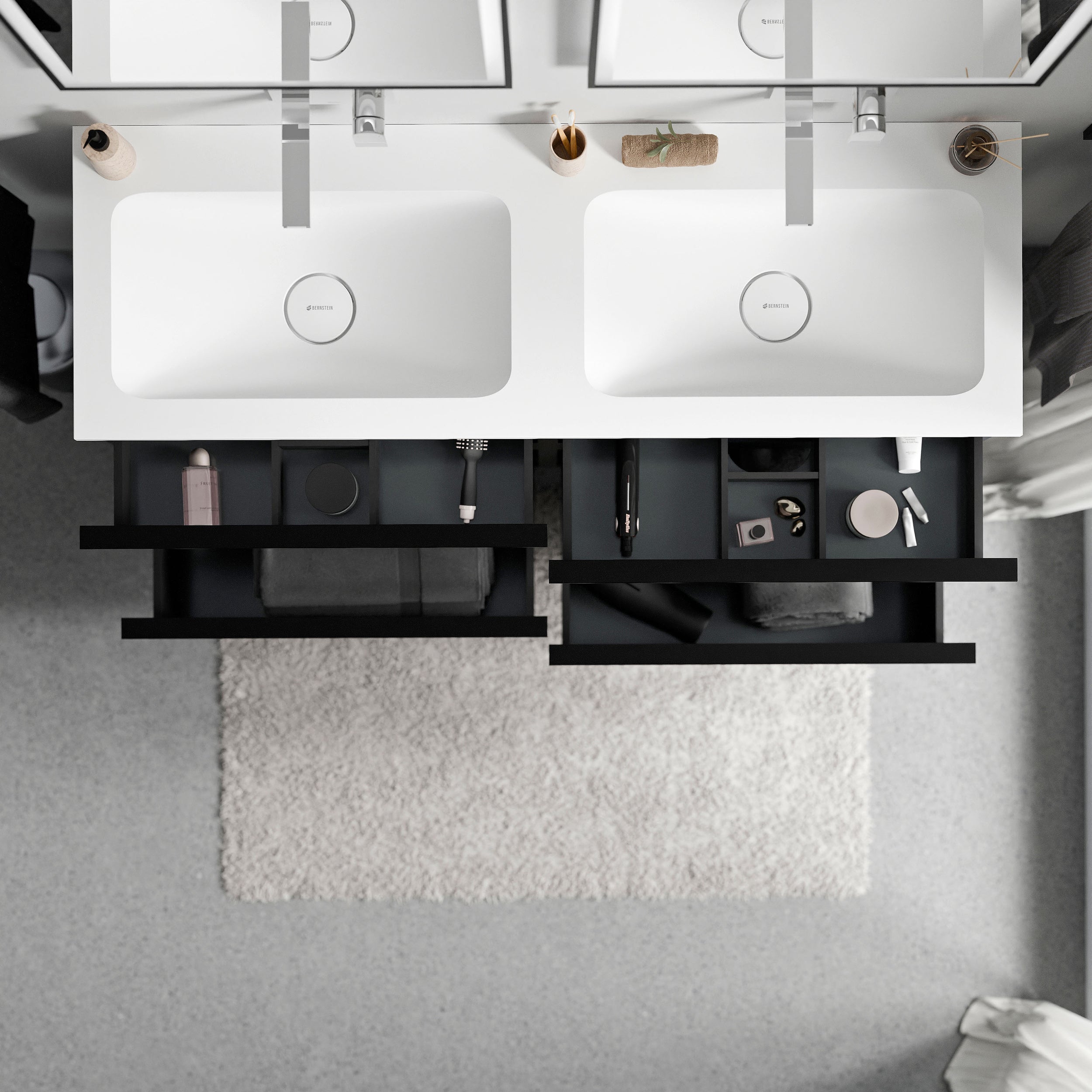 Ta szafka podumywalkowa o szerokości 120 cm i eleganckim antracytowym wnętrzu jest wyposażona w funkcję cichego domykania Soft-Close dla wygody osób śpiących do późna i tych, które wcześnie wstają z łóżka.. Dzięki zastosowaniu materiałów odpornych na wilgoć gwarantujemy, że będziesz cieszyć się tym meblem łazienkowym przez długi czas.