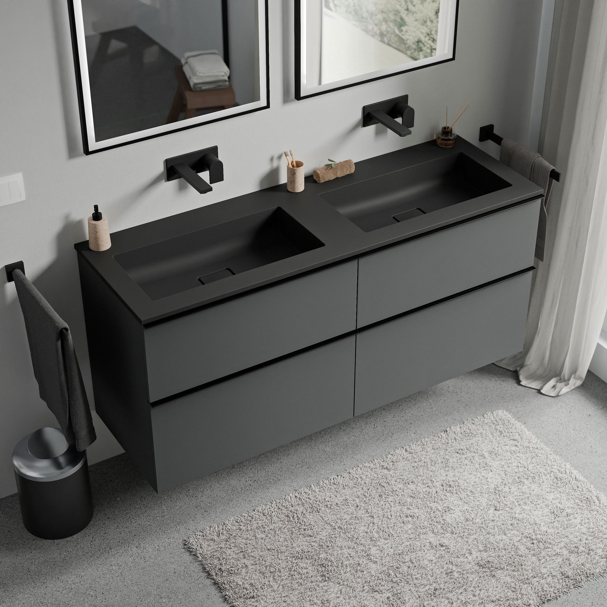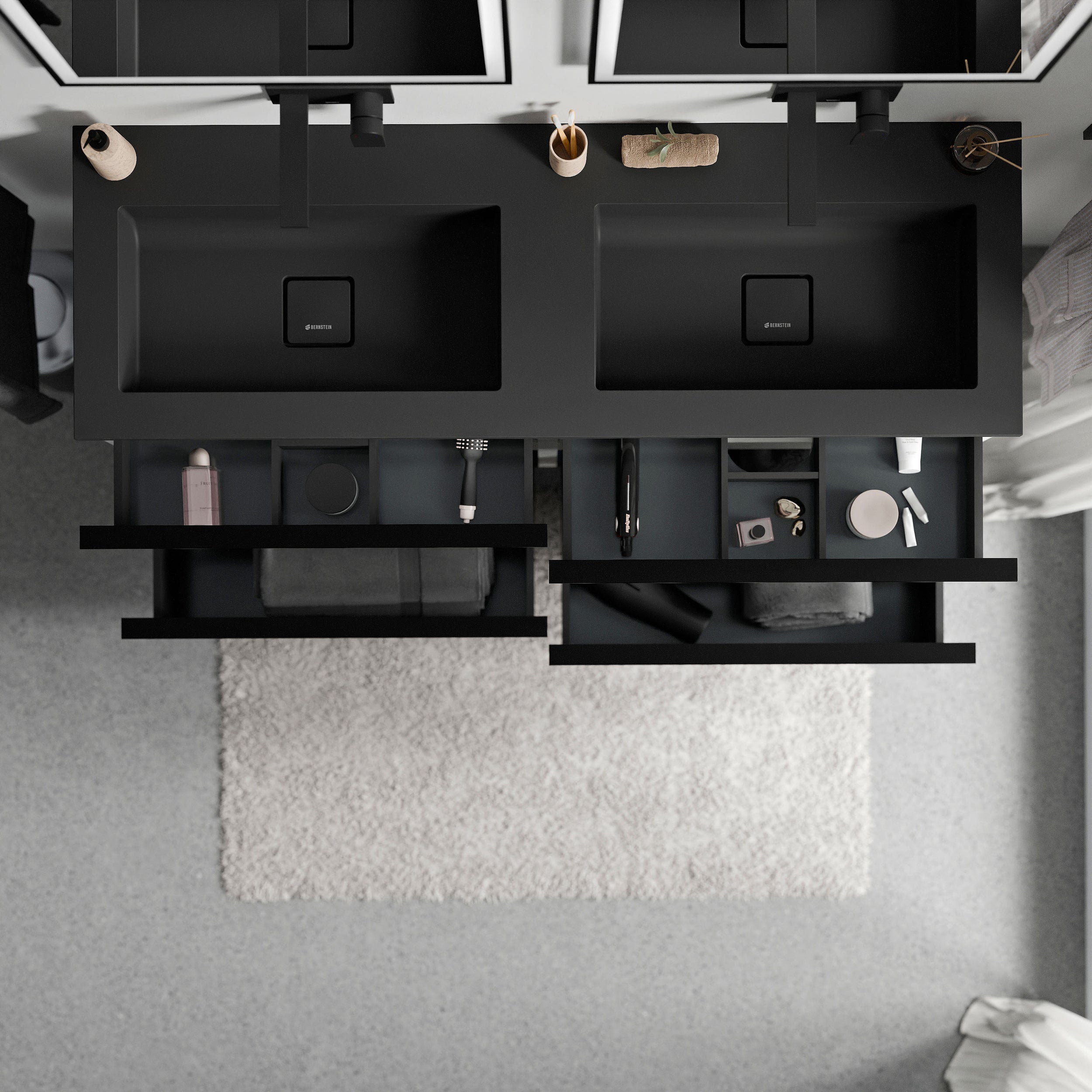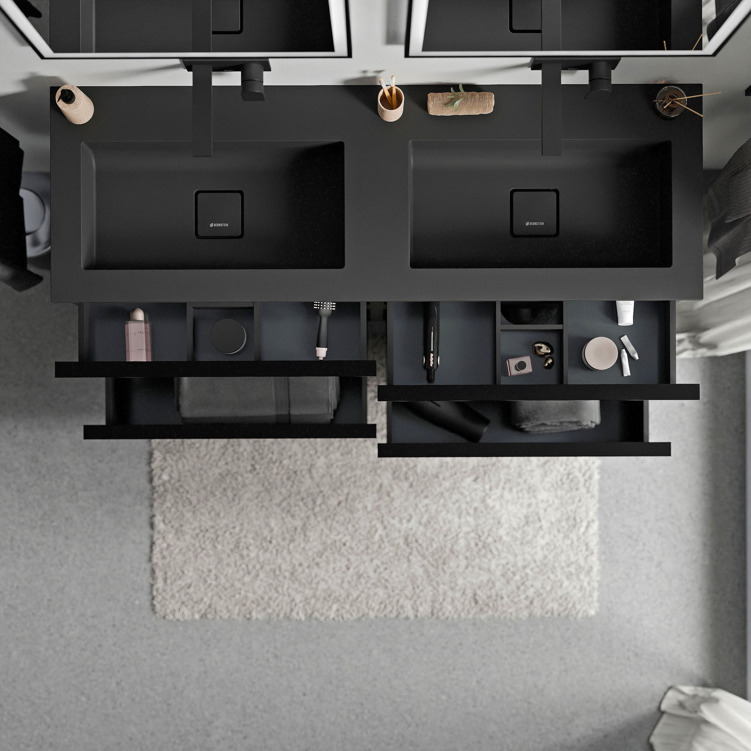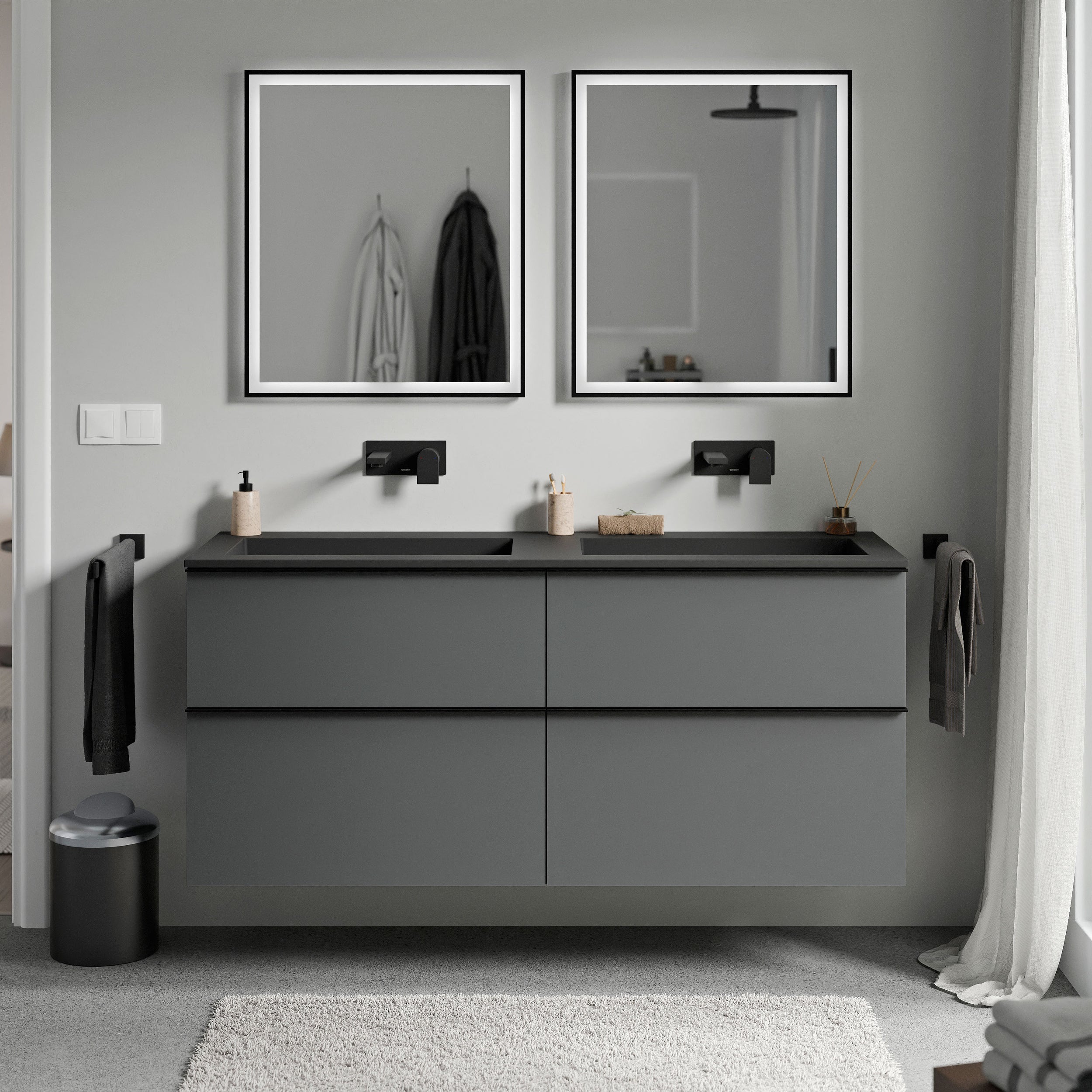 Umywalka z odlewu mineralnego, dostępna w kolorze biały mat lub czarny mat, oferuje elastyczność w projektowaniu – z otworem na baterię lub bez, w zależności od osobistych preferencji. Dopełnieniem całości są atrakcyjne baterie umywalkowe, dostępne w wersji nablatowej lub podtynkowej. Odpływ umywalkowy nie ma możliwości zamknięcia. Aby uzyskać jeszcze większą swobodę projektowania, można wybrać spośród metalowych uchwytów w kolorze chromu, matowej czerni lub matowego antracytu.