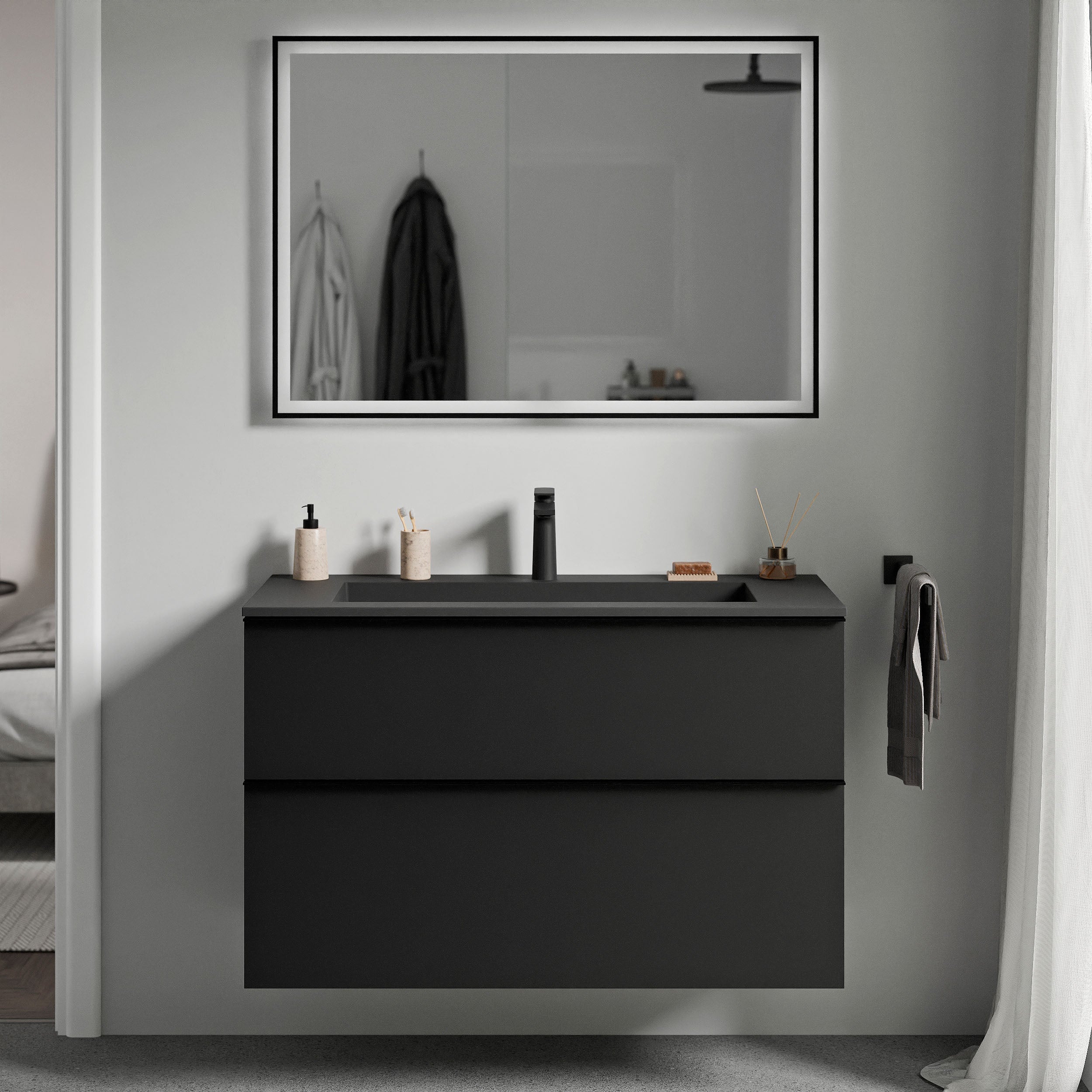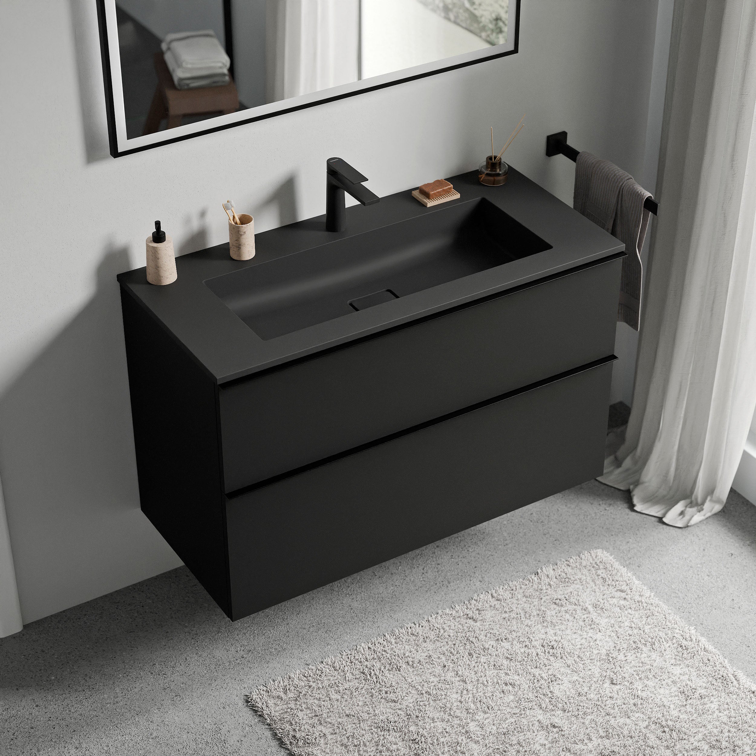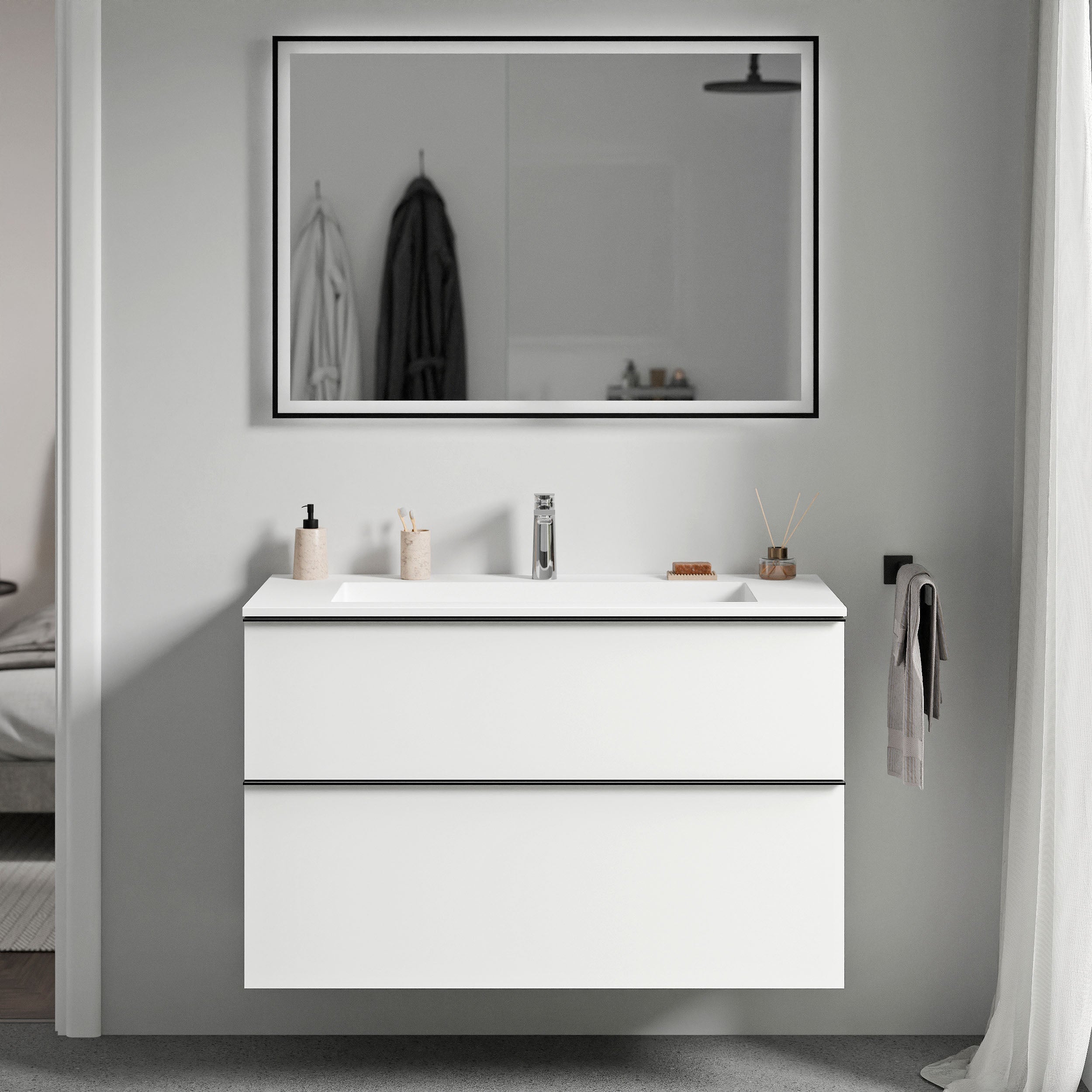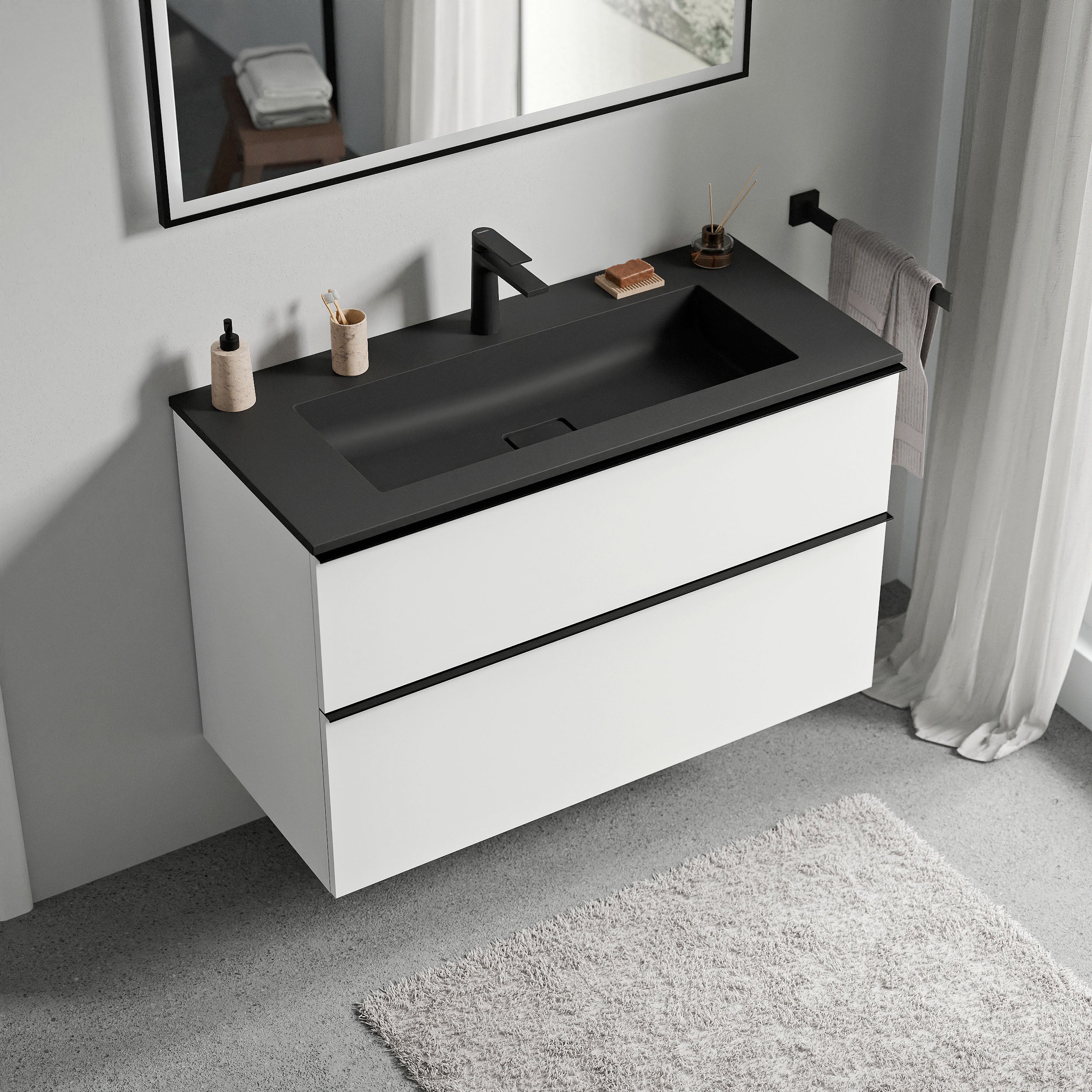 Do wyboru są eleganckie umywalki z odlewu mineralnego w kolorze biały mat lub czarny mat, każda z otworem na baterię lub bez, aby móc dostosować umywalkę do swoich potrzeb. Odpływ umywalki nie ma opcji zamknięcia. Bateria umywalkowa w wersji natynkowej lub podtynkowej oraz wybór metalowych uchwytów w kolorze chromu, matowej czerni lub matowego antracytu umożliwiają personalizację szafki podumywalkowej i umywalki.