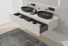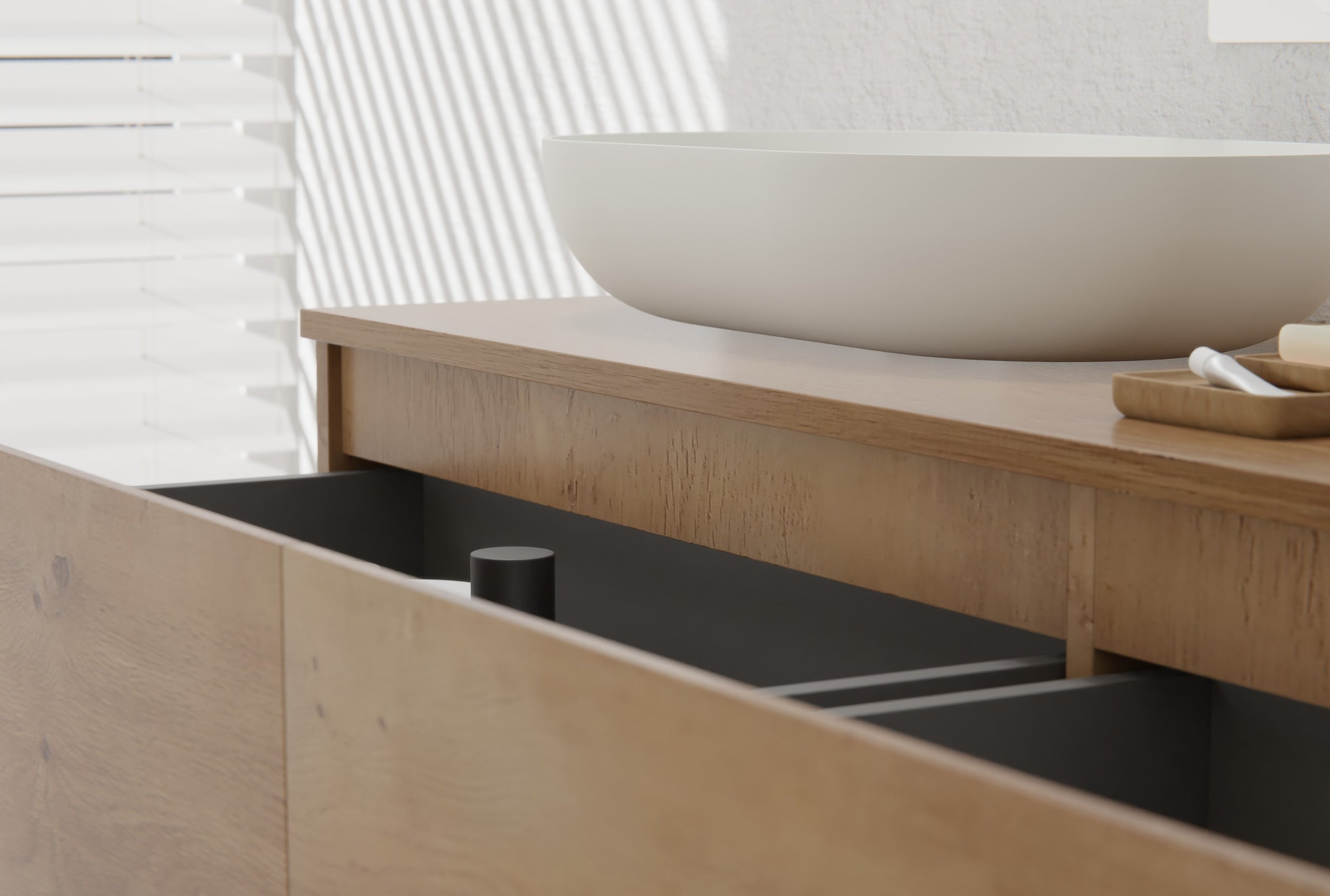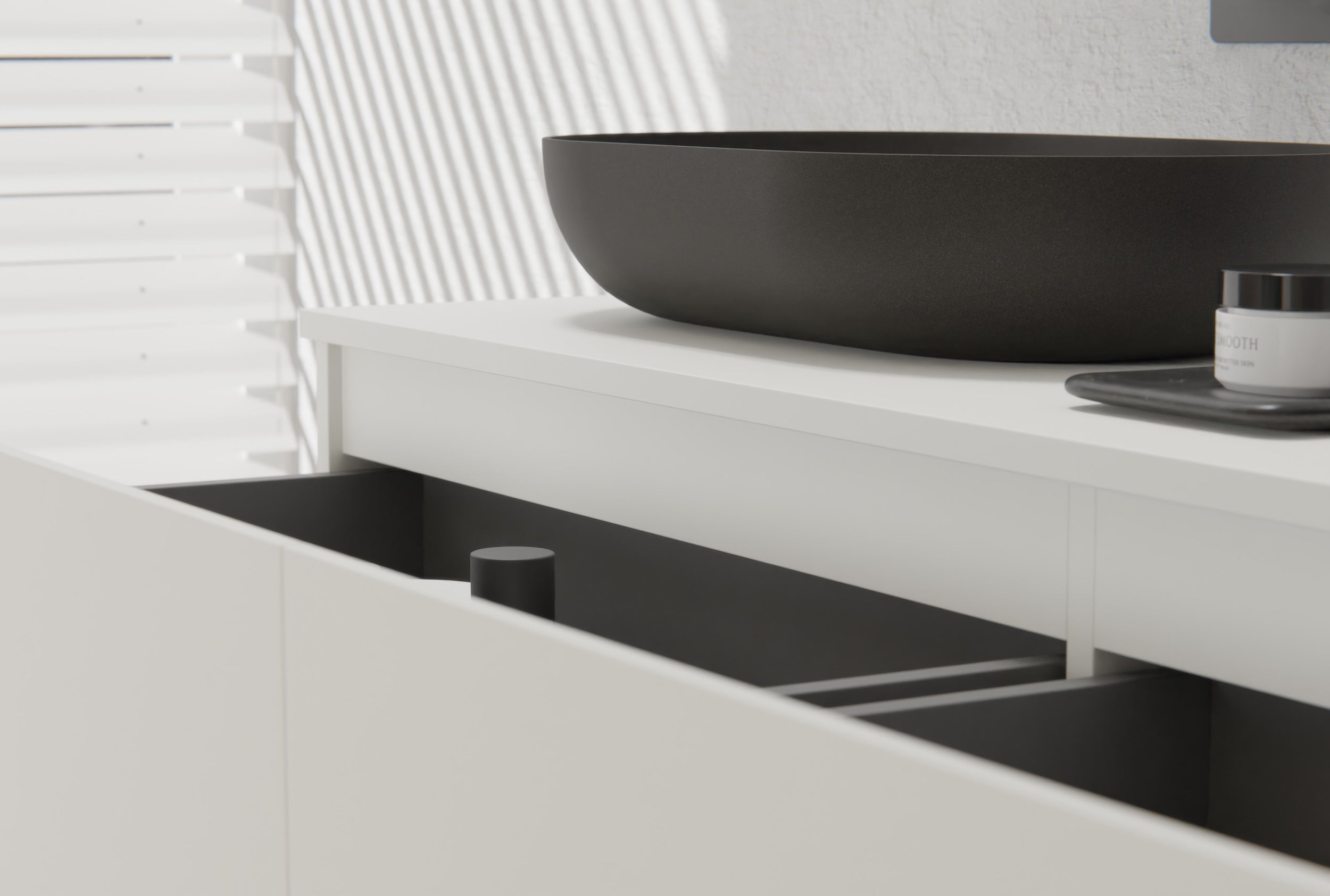 Dzięki funkcji push-open i wysokiej jakości metalowym prowadnicom szuflady otwierają się łatwo poprzez lekki nacisk. Dwie szuflady oferują Państwu wystarczającą ilość miejsca na akcesoria łazienkowe. Więcej miejsca do przechowywania uzyskają Państwo dzięki odpowiednim szafkom bocznym oraz pasującej komodzie z naszych najlepszych rekomendacji. Ze względu na ograniczoną ilość miejsca zalecamy zakup naszego sprawdzonego syfonu oszczędzającego miejsce.