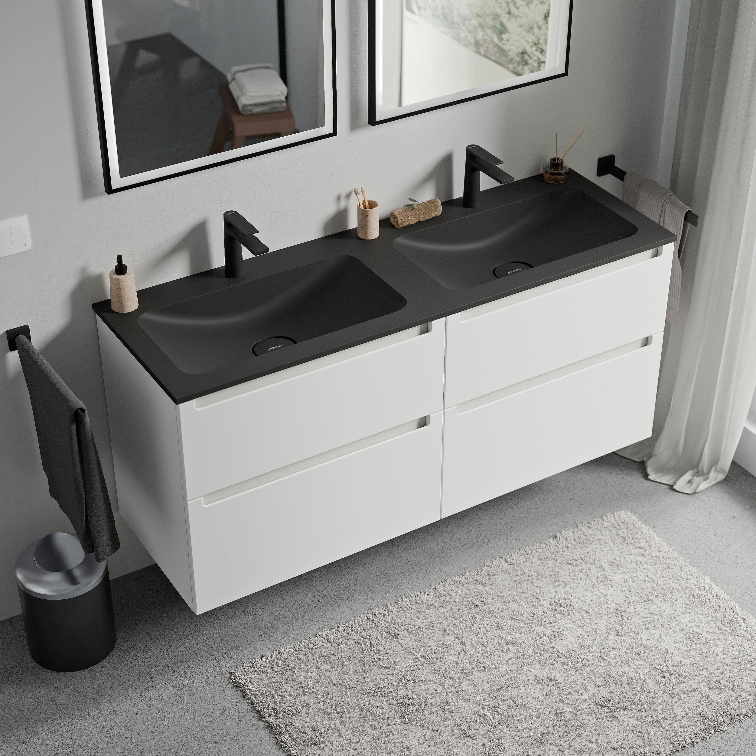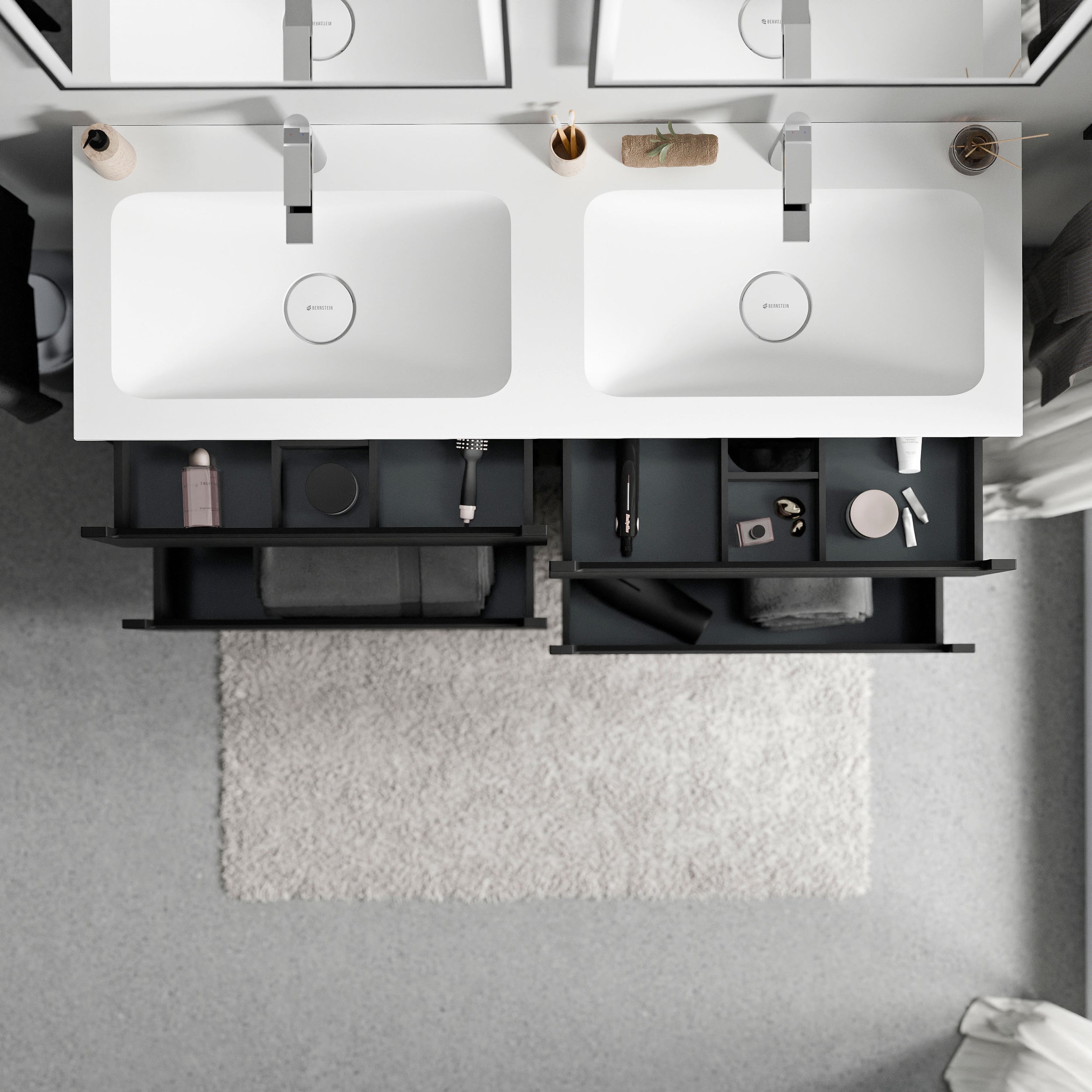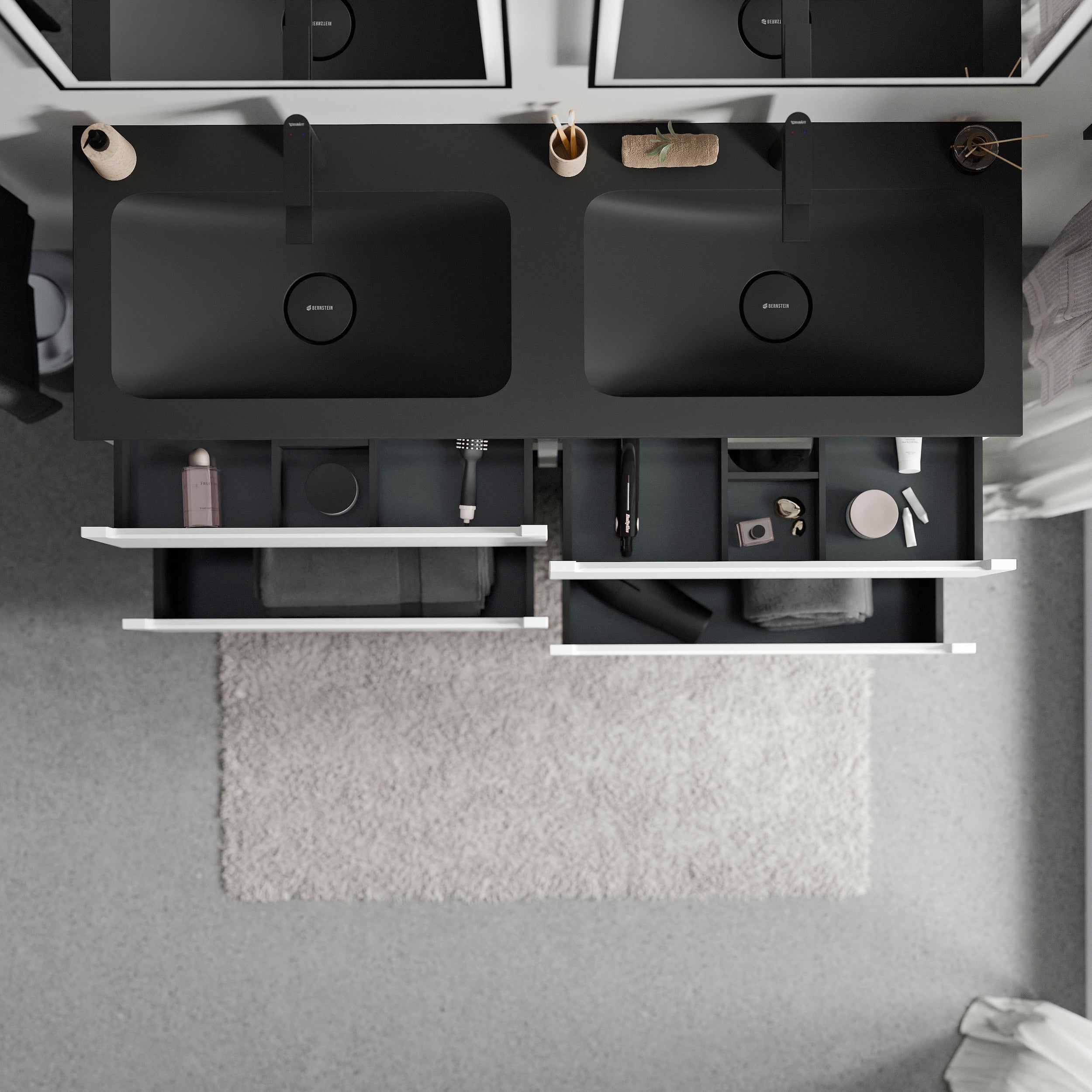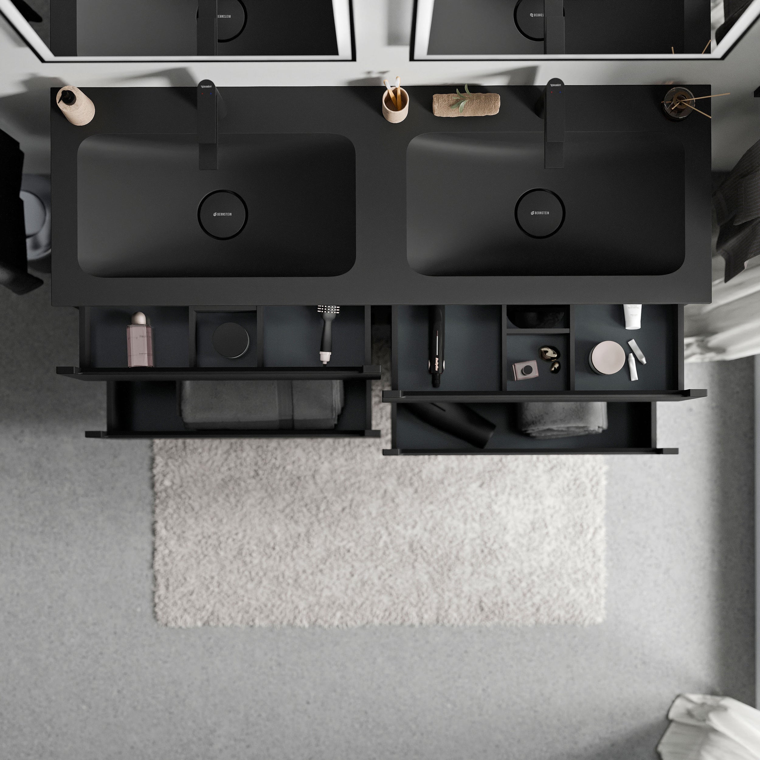 Szafka jest uzupełniona umywalką z odlewu mineralnego w kolorze białym matowym lub czarnym matowym, która nie tylko przyciąga wzrok, ale również daje swobodę w aranżacji. Dostępna z otworem na baterię lub bez, idealnie dopasuje się do Twoich preferencji i wybranej baterii umywalkowej – idealna do instalacji natynkowych lub podtynkowych. Odpływ umywalki jest bez możliwości zamknięcia.