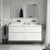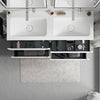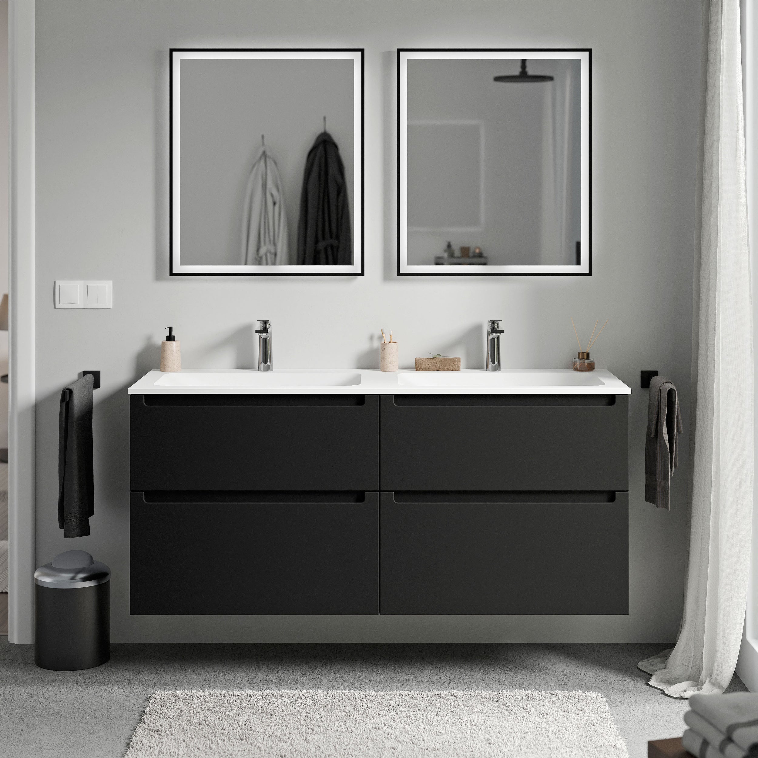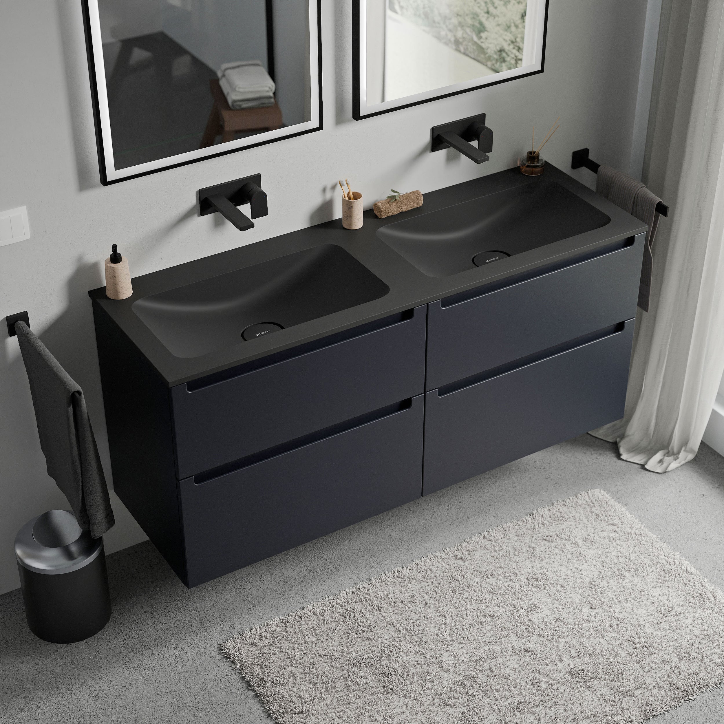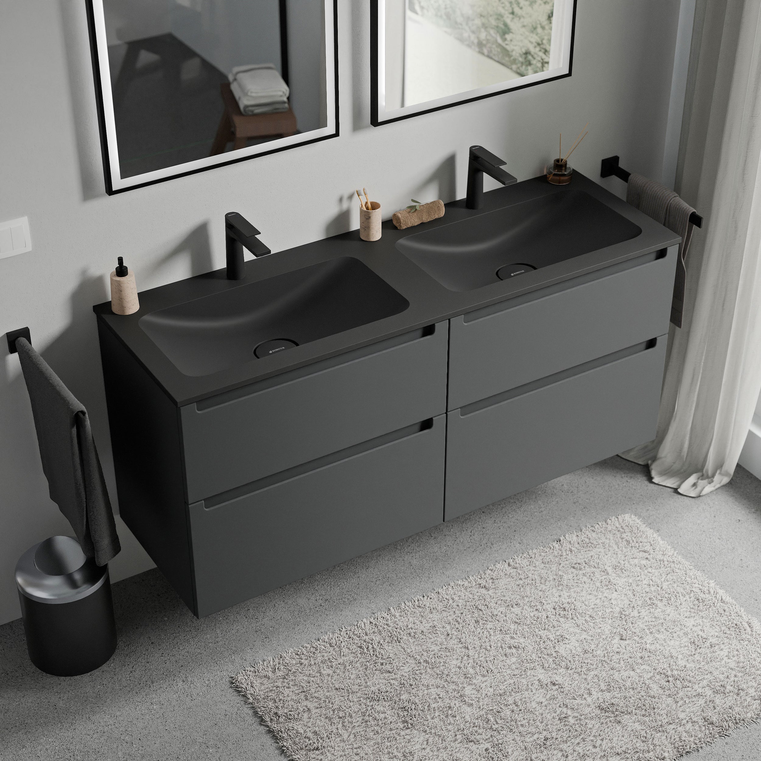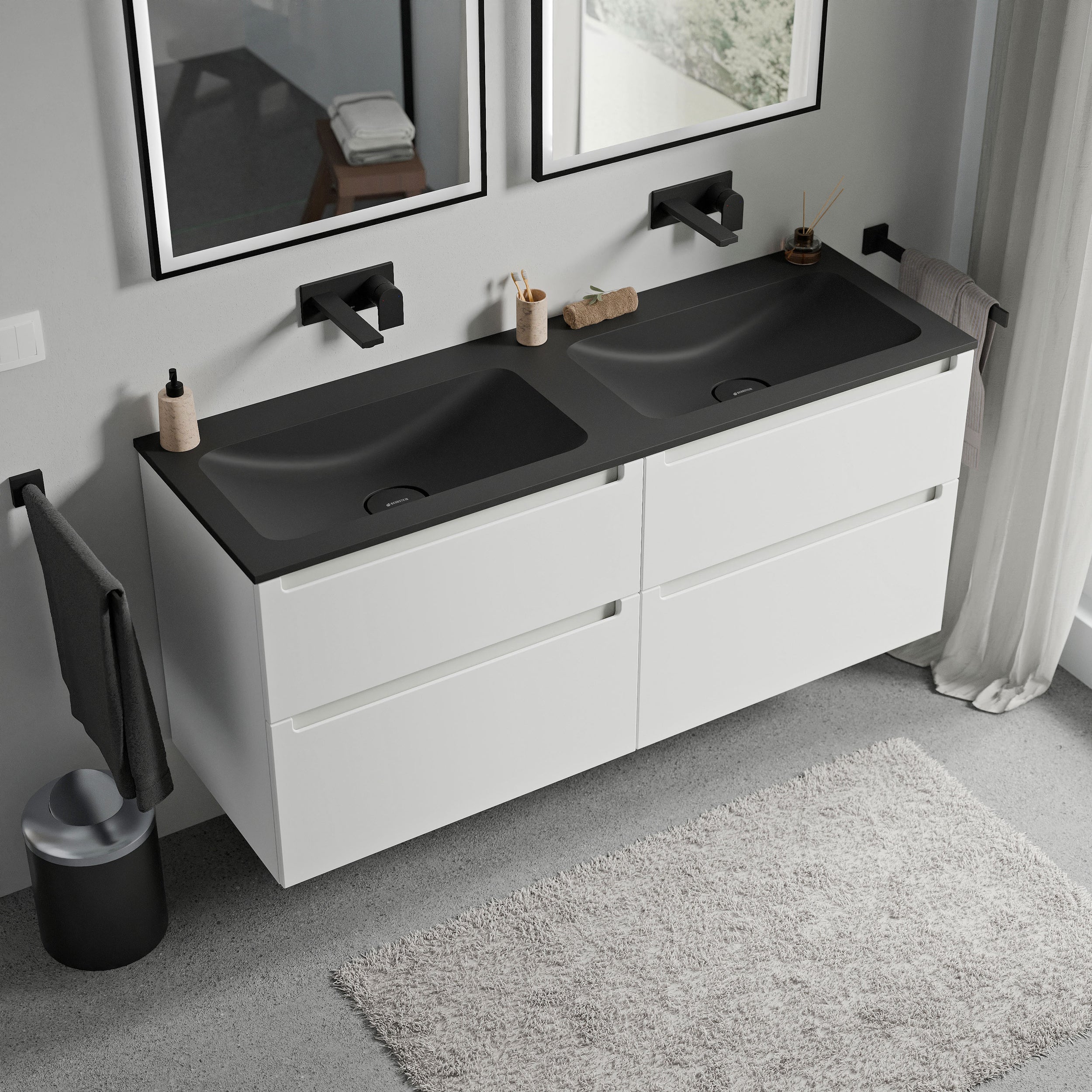 Szafka jest uzupełniona umywalką z odlewu mineralnego w kolorze białym matowym lub czarnym matowym, która nie tylko przyciąga wzrok, ale również daje swobodę w aranżacji. Dostępna z otworem na baterię lub bez, idealnie dopasuje się do Twoich preferencji i wybranej baterii umywalkowej – idealna do instalacji natynkowych lub podtynkowych. Odpływ umywalki jest bez możliwości zamknięcia.