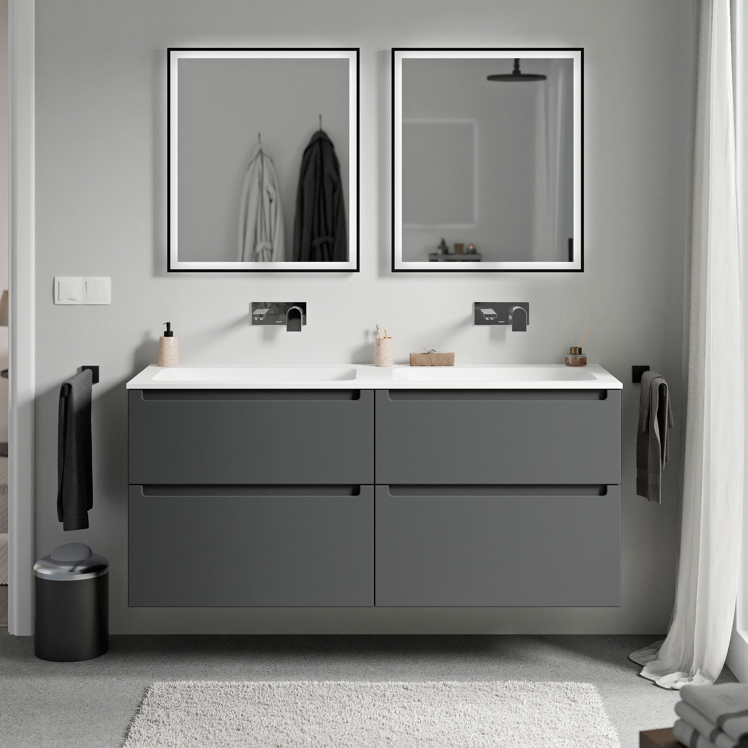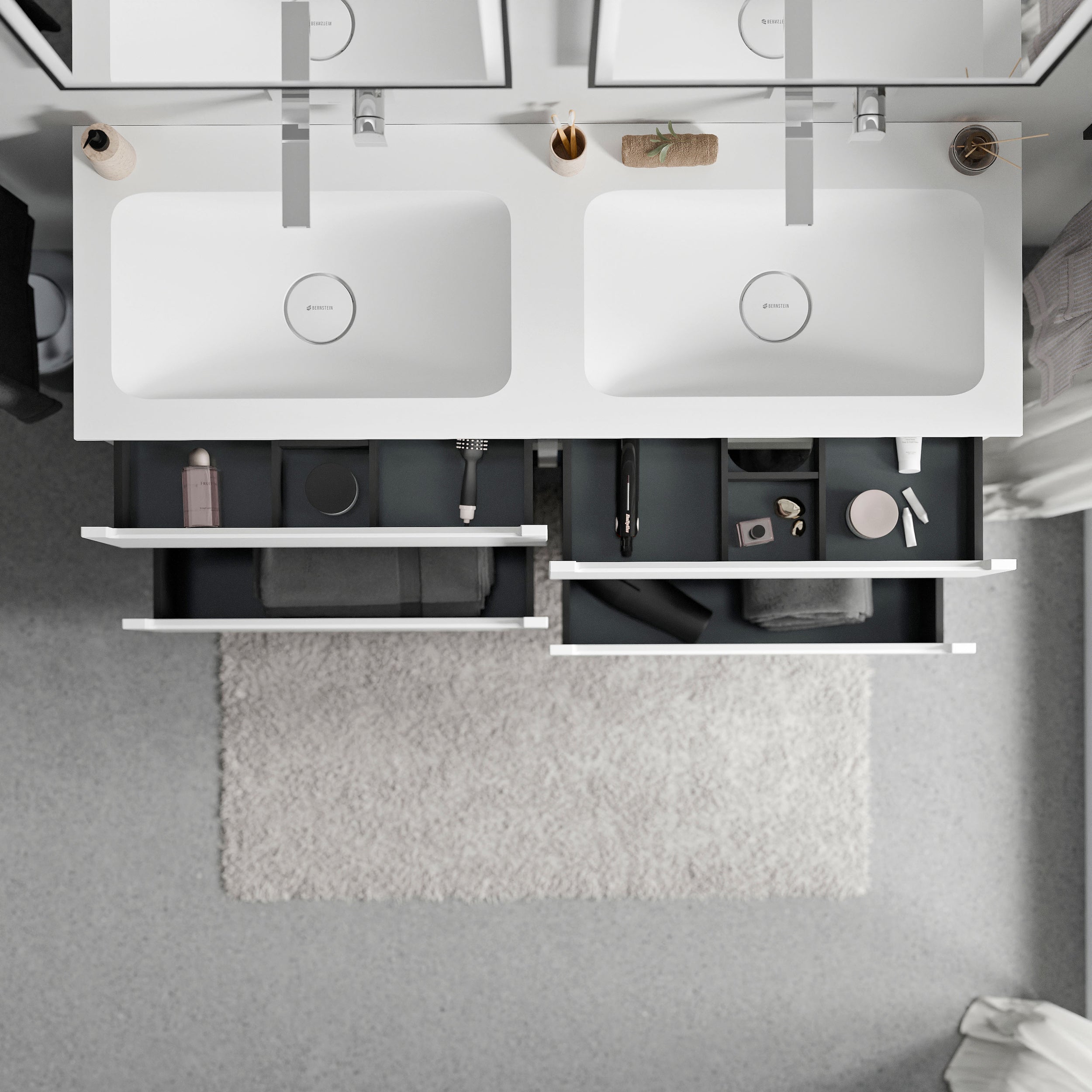 Niezależnie od tego, czy wybierzesz lśniącą biel, głębokie odcienie antracytu czy ciepły odcień dębu miodowego – szafka podumywalkowa VIREO wkomponuje się bezproblemowo w każdy design łazienki. Starannie dobrane kolory i materiały pasują zarówno do nowoczesnych, jak i tradycyjnych wnętrz. Wielokrotnie lakierowane powierzchnie gwarantują niezwykłą trwałość i minimalizują wysiłek związany z utrzymaniem czystości.