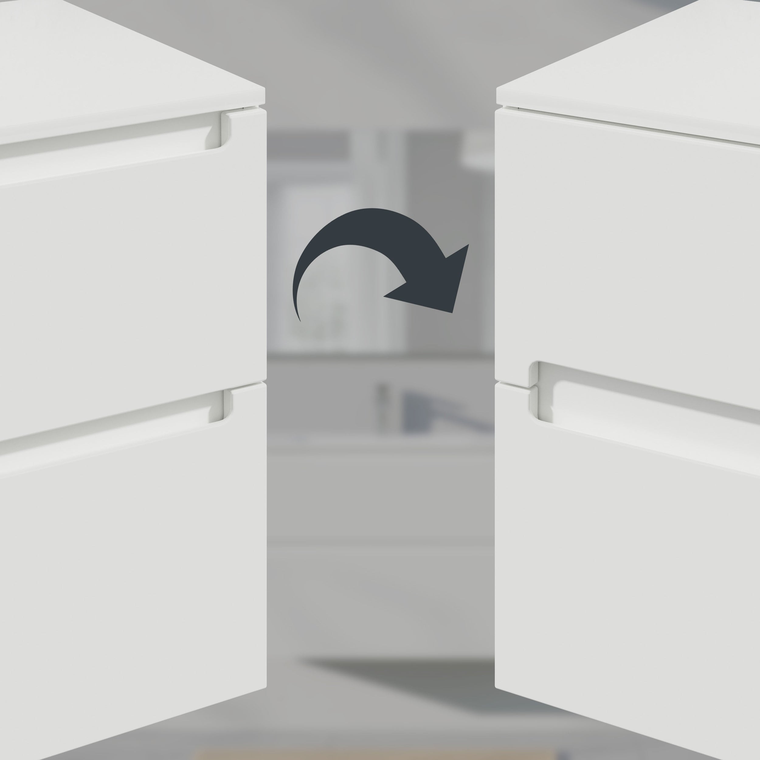 Szafka podumywalkowa wyróżnia się przemyślanymi detalami, które podnoszą codzienny komfort użytkowania. Obracany przedni panel górnej szuflady oferuje możliwość indywidualnej aranżacji. Dzięki technologii Soft-Close szuflady zamykają się cicho i delikatnie, co czyni obsługę przyjemną. Wysokiej jakości, regulowane w trzech płaszczyznach metalowe prowadnice marki Hettich optymalizują dostępną przestrzeń i umożliwiają jej efektywne wykorzystanie.
